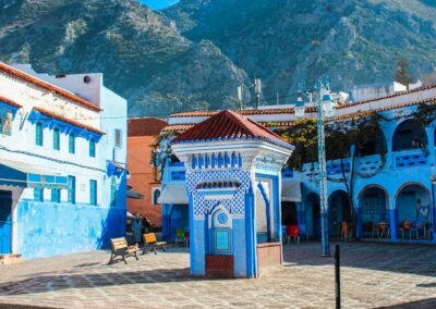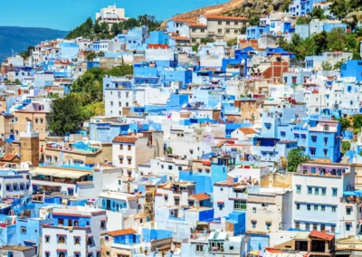 Often dubbed the “Versailles of Morocco,” Meknes boasts grand gates such as Bab Mansour, the Sahrij Swani granaries, and the medina’s vibrant souks. After exploring, we ascend through the Rif Mountains, arriving in the enchanting blue town of Chefchaouen. With its whitewashed walls, sapphire-blue houses, and mountain backdrop, it’s a photographer’s dream. Overnight in a riad overlooking the medina.