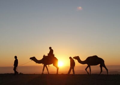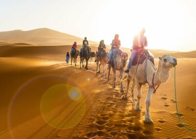 A sunset camel ride in the Erg Chebbi dunes is one of the most magical experiences the Sahara has to offer. As you sway gently atop your camel, you’ll witness the desert transform into a sea of glowing colors, gold, orange, and soft pinks, while the air fills with the stillness of evening. This short but unforgettable journey is perfect for travelers seeking an authentic desert adventure, families looking for a special activity, or couples who want a romantic moment in the Sahara.